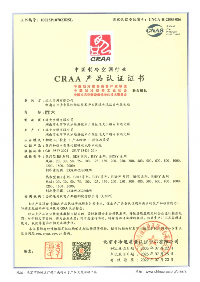 CRAA认证证书_蒸汽和热水型溴化锂吸收式冷水机组_北京中冷通质量认证中心-副证