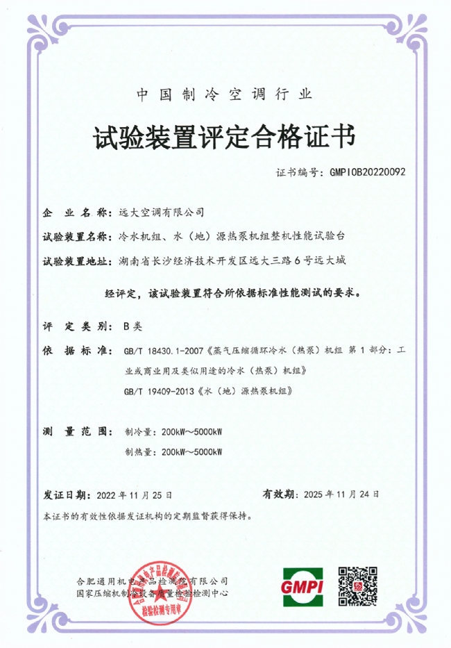 冷水机组、水(地)源热泵机组整机性能试验台合格证书