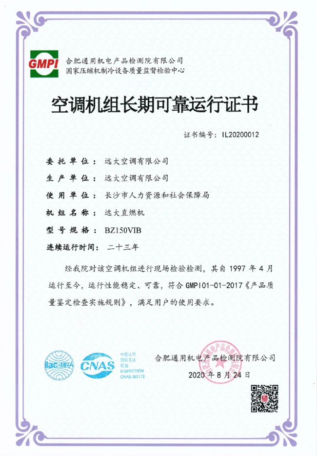 空调机组长期可靠运行证书
